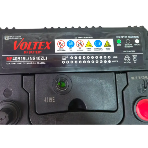 Batería Voltex 35 amperes NS40ZL con positivo derecho y borner delgado. Energía confiable para autos compactos japoneses y coreanos.
